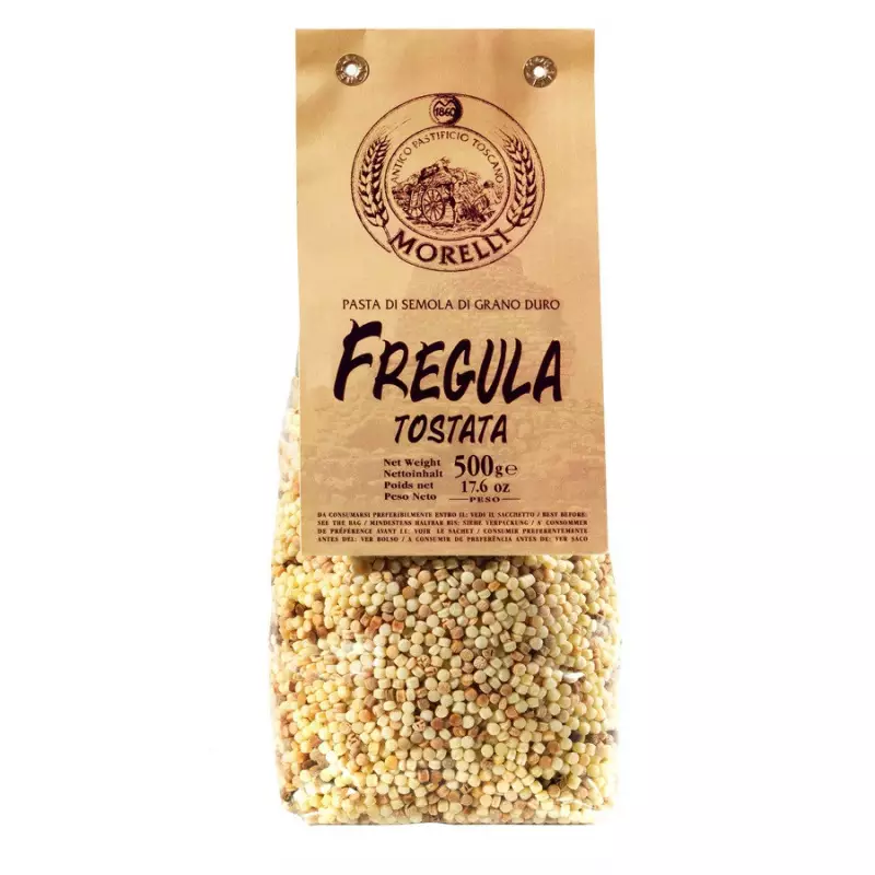 Pastificio Morelli’s durum wheat Fregula is a traditional Sardinian pasta format made of very small, irregularly sized balls, slightly larger than cous cous. The one made by the Antico Pastificio Morelli is toasted, for an extra note of flavour. It is extremely versatile as its porosity allows it to be combined with full-bodied sauces and condiments, but it is also ideal cooked in broth as a soup or risotto.