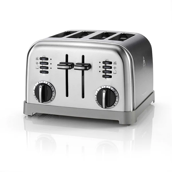 Le toaster 4 tranches Cuisinart propose 3 fonctions combinables : décongeler, réchauffer et griller. Doté de fentes extra-larges de 35 mm, il accueille les tranches fines ou épaisses, quelque soit le type de pain. Les 2 réglages indépendants de chaque couple de fentes et le thermostat 6 positions permettent de choisir précisément le niveau de brunissage du pain selon les goûts de chacun. L’arrêt et l’éjection sont automatiques. La touche Stop permet de commander l’éjection du pain avant la fin du cycle pour interrompre la cuisson. Le tiroir ramasse-miettes est amovible pour un entretien facile de votre plan de travail. En inox, ce toaster est à la fois design et robuste.