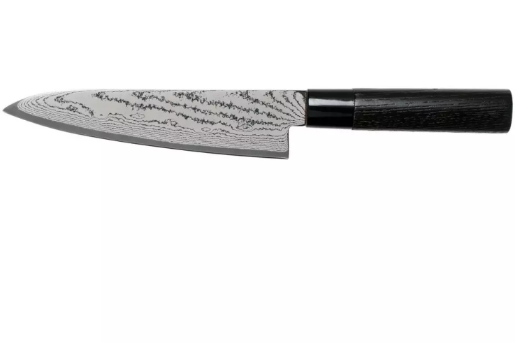 Le couteau de chef Tojiro Shippu Black damascus 18 cm est le plus petit, mais certainement pas le moindre des trois couteaux de chef de la collection Shippu black. Le couteau est facile à utiliser car la lame de 18 cm de long est légèrement plus courte qu’un couteau de chef moyen. En conséquence, ce couteau de chef est parfait pour couper des produits de petite à moyenne taille.