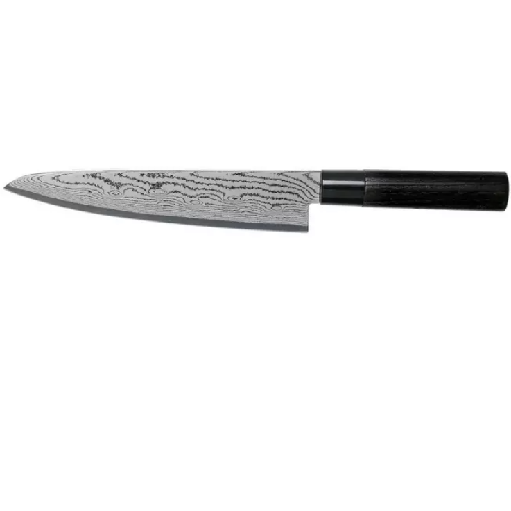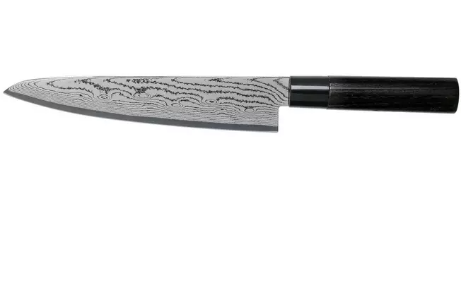 Le couteau de chef Tojiro Shippu Damas noir 21 cm est le couteau de chef par excellence. La lame de 21 cm de long est suffisamment grande et tranchante pour couper des viandes et des légumes de tous types et de toutes tailles.