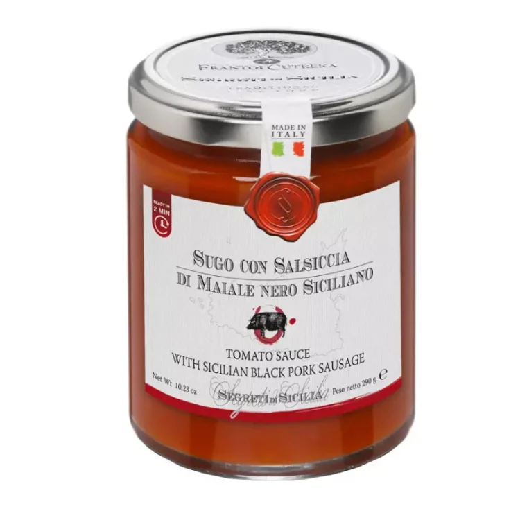 Segreti di Sicilia Pasta Sauce with Sicilian Black Pork Sausage is a typical Sicilian recipe that testifies to the influence that the crossroads of different civilizations that have passed on the island over the centuries has had on local cuisine. This ready-to-use sauce brings to your tables the flavor of a Sunday family lunch and the atmosphere of a simple and joyful party. The tomato sauce combines with the intense flavor of the meat of black pigs, a prized native Sicilian species, everything is then enriched by the unique flavor of Cutrera extra virgin olive oil. Heat for two minutes before serving. Perfect with all types of pasta and with a drizzle of raw oil.