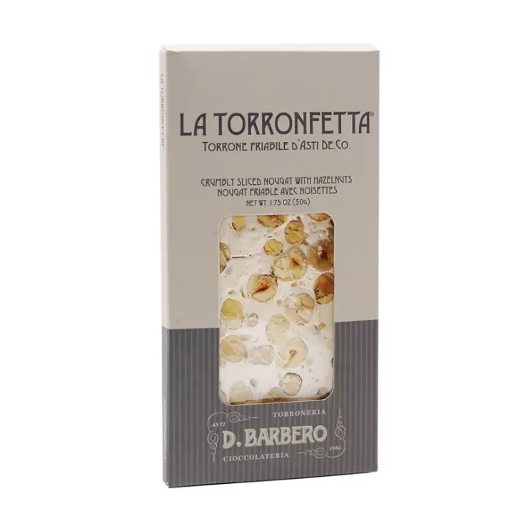 The Barbero Torronfetta with Piedmont Hazelnut IGP is a very thin and single slice of crumbly nougat that can be enjoyed in any moment of relaxation, perhaps accompanied by a good Moscato wine. The Davide Barbero Torronfette, today one of the company’s flagship products, were created at the end of the 1950s and initially represented the remainder of the processing obtained from cutting the nougat sticks. The demand for these thin and innovative slices was so high that they became one of the company’s best-selling products. The Torronfetta Like all of Davide Barbero’s nougat, it is still made with the ancient recipe of Asti nougat with long cooking in steam boilers and the use of high quality raw materials, such as Piedmont I.G.P. hazelnuts, wildflower honey , fresh egg white instead of edible gelatine.