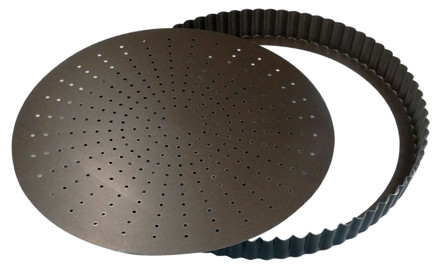 Tourtière ronde avec bord cannelé, fond mobile perforé, revêtement anti-adhérent.