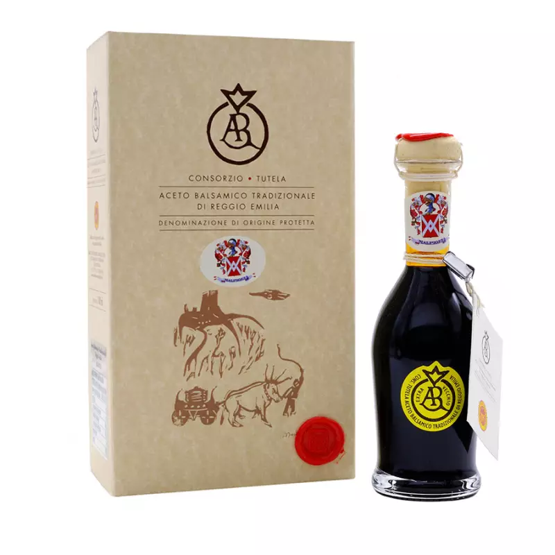 Gold DOP Traditional Balsamic Vinegar of Reggio Emilia has been produced by Acetaia Malpighi since 1995, when the company inherited a small vinegar factory in the province of Reggio Emilia. This authentic gastronomic gem carries with it centuries of culinary tradition and craftsmanship and enchants with its fragrant aroma and very balanced sweet-and-sour flavor that lends a unique touch to every dish. It is made from the cooked grape must of prized Reggiane grapes and its excellence is guaranteed by the Consortium for the Protection of Traditional Balsamic Vinegar of Reggio Emilia, guardian of its authenticity and quality. Gold Traditional Balsamic Vinegar of Reggio Emilia DOP, with its high density of 1.34, and its aging of a minimum of 25 years, is one of three selections available, along with the Silver and Lobster versions, each revealing an authentic sensory experience. Presented in an elegant 100-ml clear glass cruet, equipped with a handy dispenser, it embodies the excellence and refinement of the terroir from which it comes.
