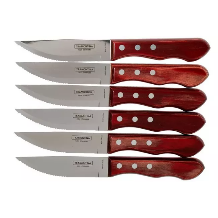 Les couteaux à steak Tramontina Churrasco Jumbo peuvent s’attaquer à tout type de viande grillée. La lame est en acier inoxydable et les manches sont en bois. Des rivets en acier inoxydable garantissent que les écailles restent en place. Le bois est modifié et passe au lave-vaisselle selon le fournisseur. Cependant, nous vous déconseillons de mettre ces couteaux dans votre lave-vaisselle
