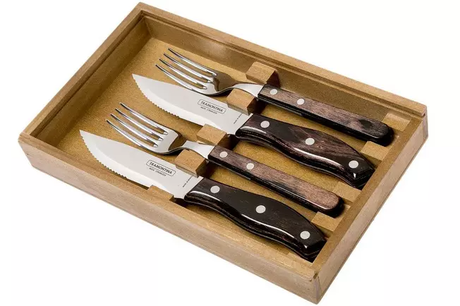 Cet ensemble de couverts à steak Tramontina Premium Rio Grande peut gérer tout type de viande grillée. Les couteaux et fourchettes sont rehaussés d’un manche robuste. Il se sent bien en main et est fabriqué à partir de Polywood certifié FSC. Bois séché exclusivement produit au Brésil. Le bois est modifié et passe au lave-vaisselle selon le fournisseur. Les manches à triple rivetage améliorent l’équilibre et la qualité globale des couverts.