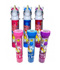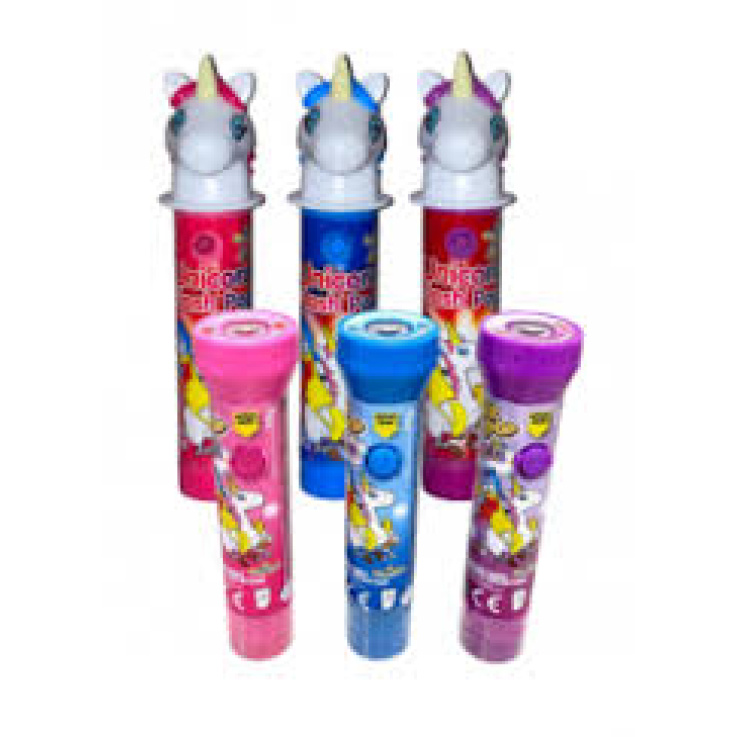FUNNY CANDY – Présentoir de 36 unités : 18 display en forme de Licorne contenant une confiserie ludique et 18 display en forme de projecteur contenant une confiserie ludique.