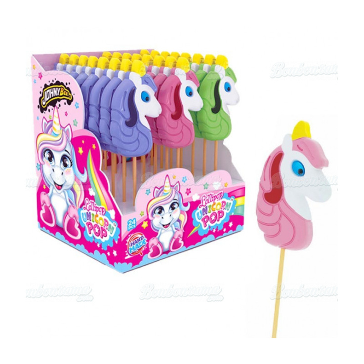 JOHNY BEE –  Sucette en forme de Licorne fait main – Vendu en gros conditionnement dans un carton présentoir contenant 24 sucettes de 40 gr – Prix de vente conseillé : 0,90 € l’unité