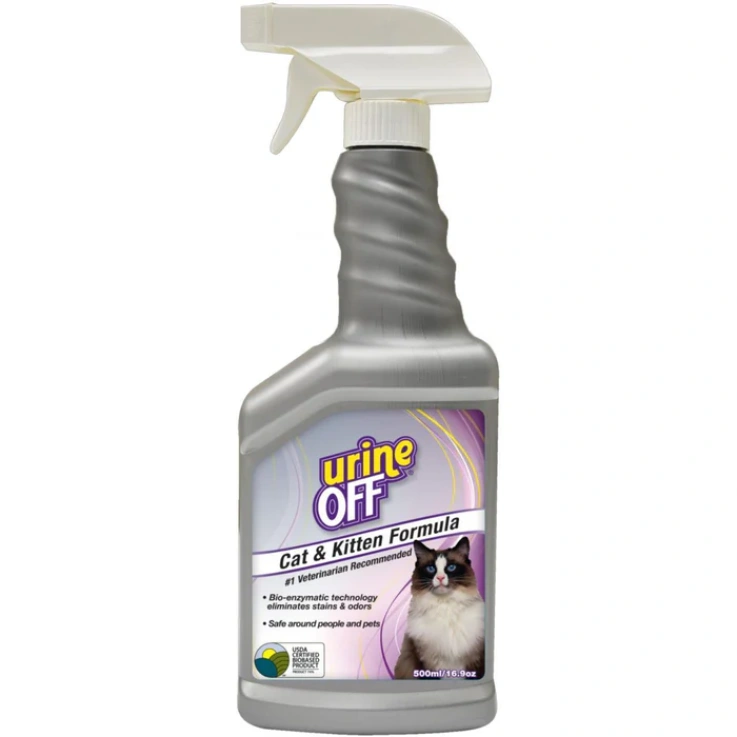 Urine off Cat & Kitten Formula is the #1 Veterinarian recommended product for pet urine odor and stain removal. In the past, pet urine odor and stains were nearly impossible to eliminate. Now, with Urine Off, you can permanently eliminate your pet’s urine odor and stains from virtually any surface. Urine Off has been awarded USDA Bio Preferred® designation as a USDA Certified Bio based Product. Urine Off is a revolutionary biotechnology product that eliminates urine odor and stains at the source, permanently. Urine Off uses a combination of naturally occurring micro-organisms and their enzymes to digest the uric acid crystals (which produce urine’s pungent aroma) as well as urea (the sticky substance in urine) and proteins (which promote pathogen growth). Can be used on Furniture and mattresses, Litter boxes, Concrete floors, hardwood floors, tiles and other hard surfaces, Clothing, bed linen and towels, Carpet, rugs and upholstery, Removes both old and fresh urine stains and odors permanently, from virtually any surface. Tackles even the strongest tom cat odors, contains pheromone blockers to help discourage marking.