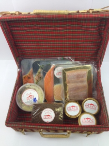 Valisette nordique composée de 100g de saumon fumé sauvage, 100g de saumon sauvage mariné, 100g de truite fumée sauvage, 100g d’anguile fumée, une verrine de tarama frais nature de 90g, un pot de harengs en sauce de 250g, une verrine d’oeufs de saumon sauvage de 100g, deux verrines de sauce à l’aneth de 100g et d’un pain noir de 500g.