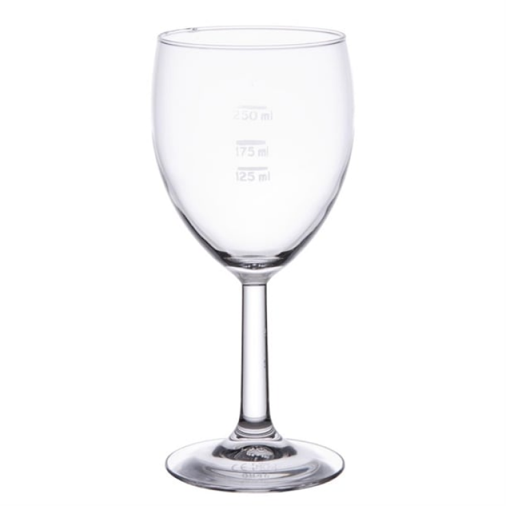 Verres à vin à pied à hauteur réduite et corps élancé, parfaits pour les traiteurs et les grandes salles de réception. Marquage CE à 125 ml, 175 ml et 250 ml.