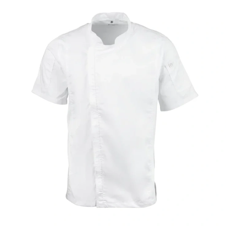 Veste de cuisine mixte avec fermeture à glissière et patte au cou pour maintenir votre tablier fermement en place. Le tissu léger, les manches courtes et les panneaux latéraux d’aération vous permettront de conserver une sensation de frais et de confort toute la journée. 160g / m².