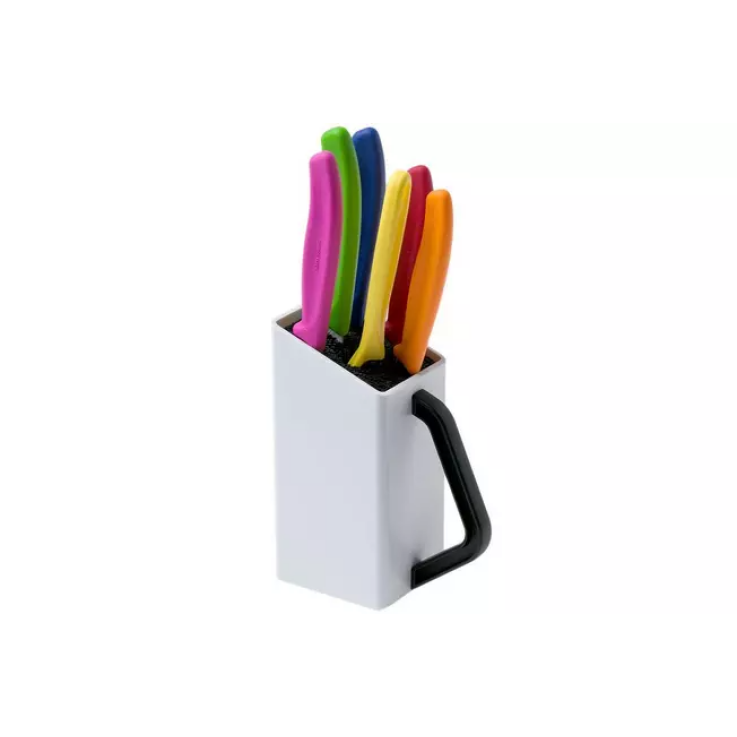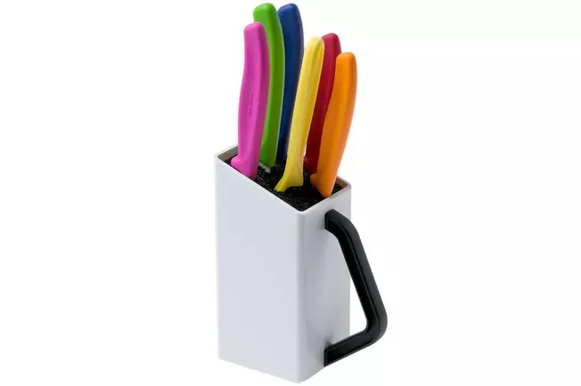 Ce bloc à couteaux coloré Victorinox Swiss Classic 6 pièces est un ajout gai et pratique à toute cuisine. Il contient cinq petits couteaux pour vous assurer d’avoir le bon couteau pour chaque tâche dans la cuisine. Grâce aux différentes couleurs, vous savez également immédiatement quel couteau utiliser pour quelle tâche.