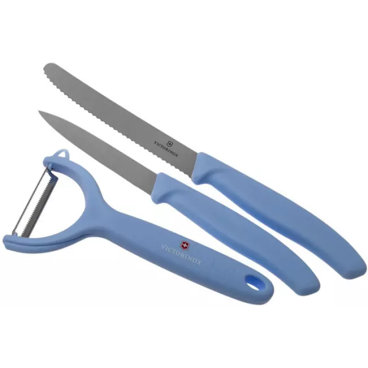 Cet ensemble de couteaux à légumes bleu Victorinox SwissClassic est composé d’un couteau à tomates, d’un couteau à légumes et d’un éplucheur. La lame du couteau à tomates mesure 11 cm et celle du couteau à légumes mesure 8 cm.