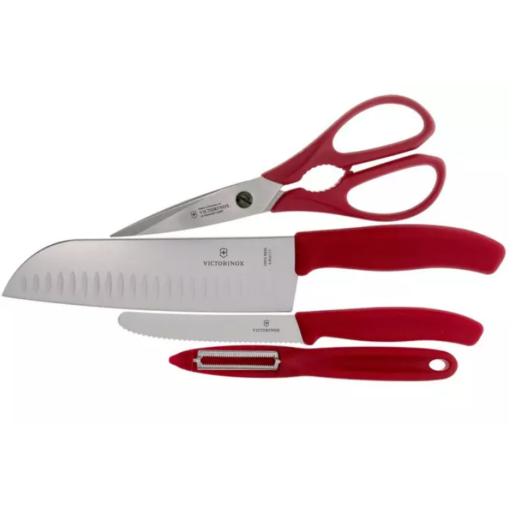 Le set de 4 couteaux de cuisine Victorinox SwissClassic rouge dans un coffret cadeau est le cadeau parfait pour tous ceux qui aiment cuisiner. Avec cet ensemble, vous avez tout ce dont vous avez besoin pour accomplir n’importe quelle tâche dans la cuisine. Vous pouvez facilement éplucher les pommes de terre avec l’éplucheur, ouvrir les boîtes avec les grands ciseaux et couper de gros morceaux de fruits et légumes avec le couteau Santoku polyvalent. Le couteau à tomates/légumes dentelé peut gérer toute autre tâche laissée dans la cuisine.