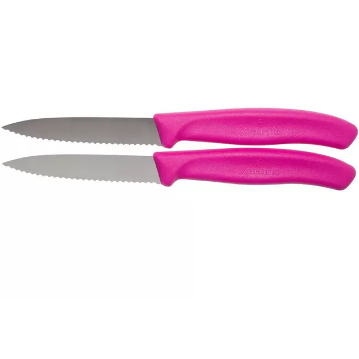 These two Victorinox SwissClassic serrated vegetable knives pink are versatile additions to any kitchen and on the table. Because of the small, thin blade and the serrated edge you can easily peel and cut vegetables, fruit or a small loaf of bread.