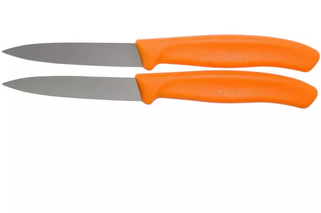 These two Victorinox SwissClassic vegetable knives orange are versatile additions to any kitchen and on the table. Because of the small, thin blade and the sharp edge you can easily peel and cut vegetables and fruit.