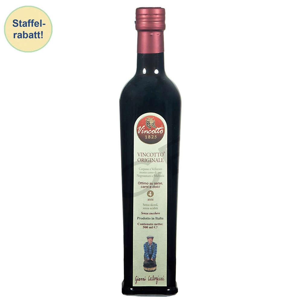 Vincotto originale 500 ml dans une bouteille en verre . Noble spécialité pour sucrer et aromatiser. Moût de raisin cuit, élevé pendant environ 4 ans en fûts de chêne – Calogiuri.