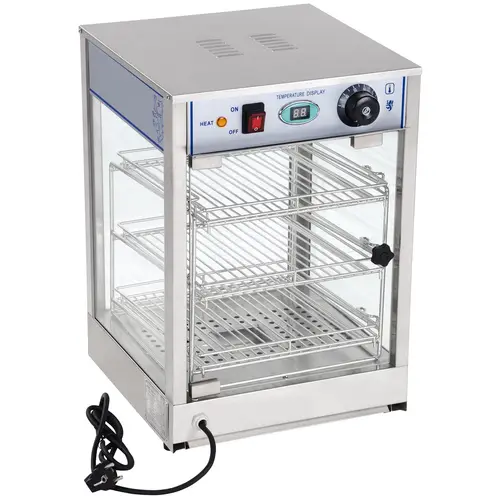 La vitrine chauffante Royal Catering RCHT-850 a été conçue pour un usage professionnel. La vitrine chauffante se compose d’acier inoxydable de grande qualité et est donc efficacement protégé contre la corrosion. La vitrine rectangulaire a l’avantage sur les modèles inclinés d’offrir plus de place pour vos plats. La vitrine chauffante Royal Catering offre une ample surface de rangement grâce à ses trois plateaux en acier inoxydable. Un système de glissière empêche que les plateaux ne tombent ou ne basculent. Chaque plateau a une dimension de 29 x 30 cm. Grâce à ses éléments chauffant performants de 850W, la vitrine chauffante atteint trés rapidement sa température de service. La température peut-être ajustée avec le thermostat en continu et avec précision jusqu’à 85°C maximum. La vitrine chauffante dispose d’un contrôle de stabilité de la température entièrement automatique et celle-ci est indiquée numériquement. La vitrine chauffante dispose d’un récipient à eau assurant une douce humidification de vos spécialités culinaires, afin que la chaleur ne les dessèche pas. Par ailleurs, la partie inférieure de l’appareil est équipée d’un tiroir amovible de récupération des miettes. Le nettoyage de la vitrine chauffante est très simple.