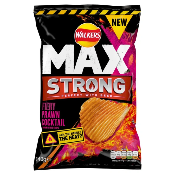 Walkers Max Strong the irresistible, deep ridged crisp packed with bold flavor perfect with beer. Enjoy the ultimate taste experience in every bite. No Added MSG, No Artificial Preservatives or Colors, Suitable for Vegetarians.
