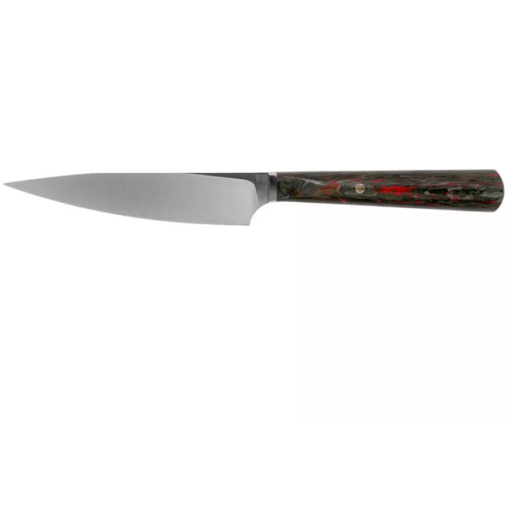 Le couteau utilitaire en fibre de carbone WE Knife Yakula Red & Black est un couteau de cuisine moderne au design audacieux. Le couteau est léger et a une lame relativement petite. En tant que tel, il est idéal pour les petites tâches dans la cuisine telles que hacher finement les oignons, l’ail ou les herbes. En raison de la conception remarquable de ce couteau, vous pouvez également l’utiliser comme couteau à steak !