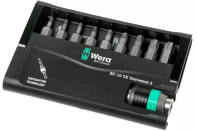 Le jeu Torx universel 10 pièces Wera Bit-Check 10 Torx 5057115001 est un jeu de 10 tournevis Torx différents dans un ensemble compact et bien organisé qui tient même dans votre poche. L’ensemble utilise une connexion de 6,35 mm (1/4″). Indispensable pour les techniciens, les opticiens, les ingénieurs de précision, les horlogers, les bijoutiers, les mécaniciens de quincaillerie, les maquettistes et bien sûr pour ceux qui veulent entretenir leurs propres couteaux et autres outils.