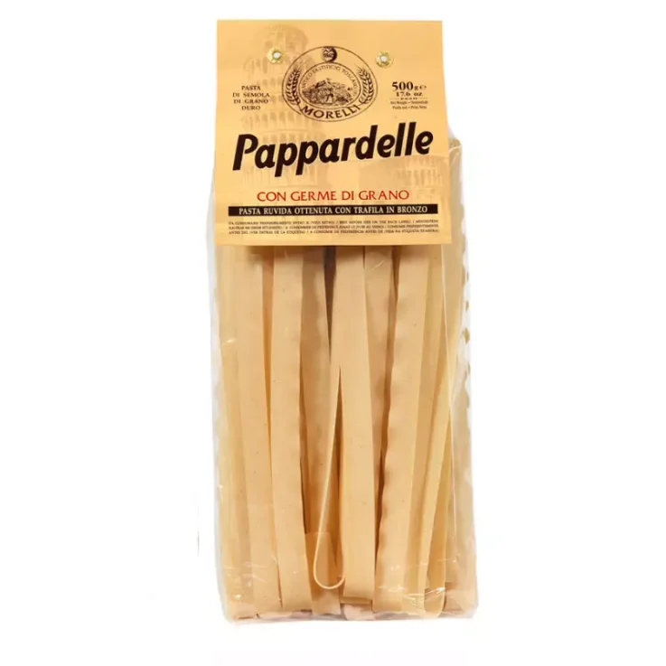 Pappardelle is one of the most typical pastas of Tuscany. To appreciate it best, a good ragout of game is recommended. Typical of this tradition are, for example, Pappardelle alla lepre (Pappardelle with hare). Those from Antico Pastificio Morelli are distinguished by the presence of wheat germ, rich in vitamins and vegetable proteins. Pappardelle with wheat germ are dried at low temperatures to maintain the flavor of the wheat.