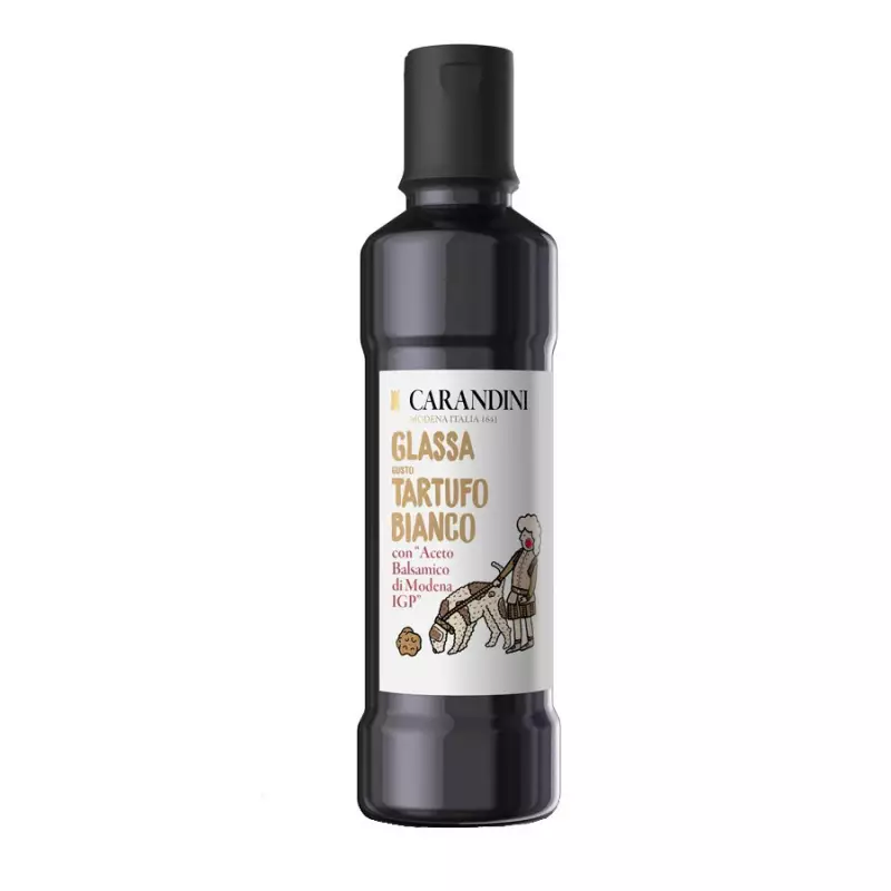 The Carandini Glaze with Balsamic Vinegar of Modena IGP and White Truffle has a balanced and refined taste and is ideal for making your dishes more delicious. Perfect on meat, cheese, french fries and to enhance risottos. Thanks to their creamy consistency and balanced flavour, Carandini creams with balsamic vinegar of Modena PGI allow you to experiment, decorate and color many dishes, both sweet and savoury. Glaze is an ideal product to add flavor quickly and easily.