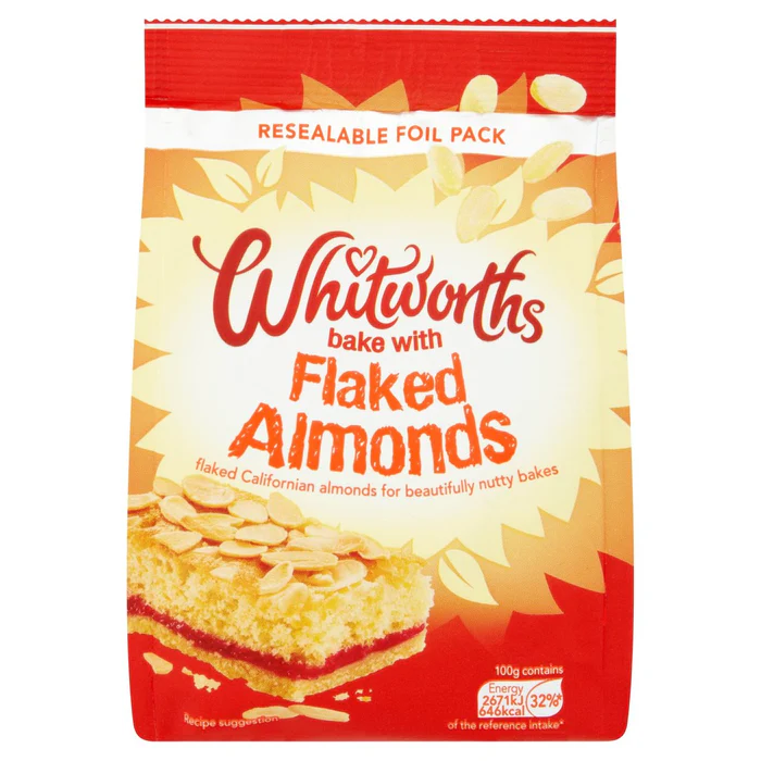Whitworths Flaked Almonds. Flaked Californian almonds for beautifully nutty bakes, Suitable for vegetarians.