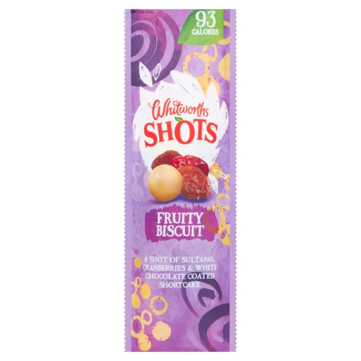A shot of sultanas, cranberries & white chocolate coated shortcake. 93 Calories, A Shot of Sultanas, Cranberries & White Chocolate Coated Shortcake, Suitable for Vegetarians.