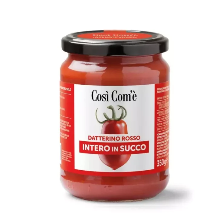 The red datterino tomato in Così Com’è in juice is distinguished from other tomato varieties by its elongated shape that resembles that of a date. The red date tomato Così Com’è has a high sweetness, almost double that of a classic tomato variety, has an intense flavor and an extremely thin skin with a bright red color. This type of tomato has a texture that makes it storable longer after harvest. It is perfect for preparing quick recipes because it requires short cooking time. Because of its sweet and intense flavor, it is ideal for preparing sauces or bases in which to stir-fry or boil vegetables, spaghetti and other pastas, ingredients that are already cooked or that cook quickly such as seafood, fillets and slices of fish, meatballs, and slices of fresh cheese in a few minutes.