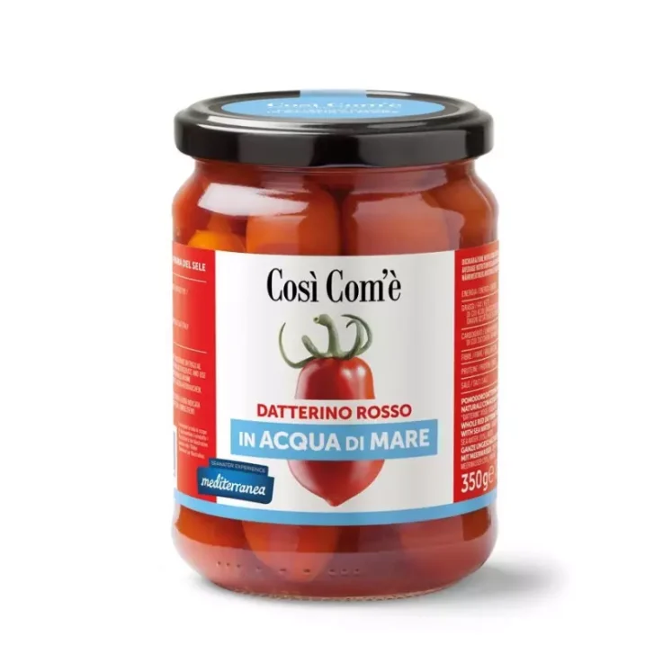 The red date tomato in seawater Così Com’è is distinguished from other tomato varieties by its elongated shape that resembles that of a date. It has a high sweetness, almost double that of a classic tomato variety, an intense flavor and an extremely thin skin with a bright red color. This type of tomato has a texture that makes it storable longer after harvest. In this version, red Datterini tomatoes Così Com’è are perfectly maintained in the natural nourishment of seawater. Thanks to this preservation method, the flavor of Red Datterino gives the right note of flavor to every dish. Seawater, moreover, is more than just water and salt, as it contains a full range of minerals and trace elements in the optimal form, proportion, and balance.