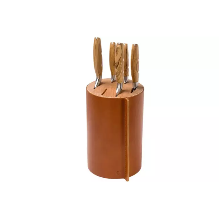 Cet ensemble de cinq couteaux Wüsthof Amici comprend un couteau de chef, un santoku, un couteau à pain, un couteau à éplucher et un couteau à saucisse. Il est livré avec un joli bloc à couteaux au design unique. Le bloc est en bois d’olivier, recouvert de cuir de vachette italien. En tant que tel, le bloc semble très luxueux. En plus des cinq couteaux fournis avec le bloc, vous avez également assez de place pour un autre couteau. L’espace vide mesure 5,9 cm de large. Toutes les ouvertures de ce bloc ont une profondeur de 23 cm. Cela signifie que la lame peut mesurer 5,9 cm de haut et jusqu’à 23 cm de long. En raison de la forme de l’ouverture, vous pouvez également ajouter un fusil à aiguiser (jusqu’à 1,3 dm) ou une fourchette à viande (jusqu’à 3 cm de large).