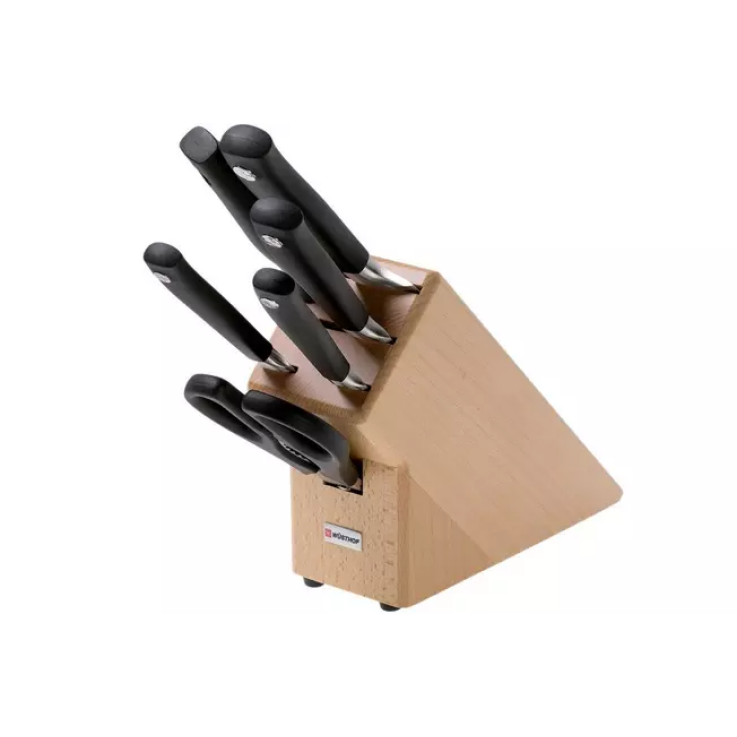 Cet ensemble de sept couteaux Wüsthof Grand Prix II se compose de quatre couteaux de cuisine différents, de ciseaux de cuisine et d’un fusil à aiguiser. L’ensemble comprend également un bloc de couteaux en bois. L’ensemble se caractérise par sa facilité d’entretien, son équilibre optimal et sa sécurité. Les couteaux rappellent quelque peu leurs homologues de la série Classic mais ont un design un peu plus contemporain.