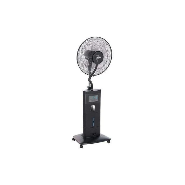 Ventilateur brumisateur sur pied diametre 40cm, puissance 100W, 3 vitesses et 3 modes : normal (continu), naturel (aléatoire) et nuit (silencieux), oscillant +/- 55°, inclinaison réglable, hauteur 130cm, 3 pales plastique transparentes, réservoir 1.5L avec acces a l’avant pour plus d’aisance au remplissage, corps plastique noir, 3 pales plastiques transparentes, socle avec 4 roulettes multi-directionnelles pour dépla