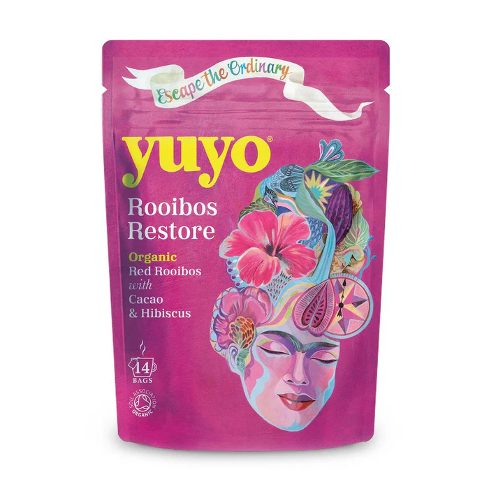 Escape the Ordinary with Yuyo Rooibos Restore, a restorative infusion of red rooibos with cacao and hibiscus. Kick your shoes off and feel yourself again with this beguiling blend of chocolate and cherry-tart notes. Vanilla pod and liquorice mean this infusion is sugar free and yet naturally sweet. The pack contains 14 bags of blended premium rooibos and other botanicals. – Certified organic with the Soil Association, vegan, gluten free and dairy free. Naturally caffeine free.